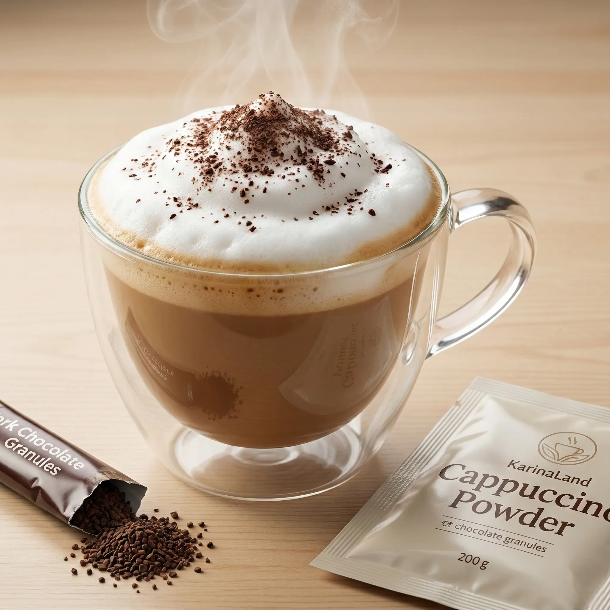 - فوم بوستر (Foam Booster) : ما در این ترکیب از فومرهای قوی استفاده کردهایم. وقتی آب جوش اضافه میشود، صدای "فیس" ملایمی میشنوید و کفِ نوشیدنی بالا میآید. این کف فقط هوا نیست، بلکه بافتی خامهای دارد که روی لب مینشیند.