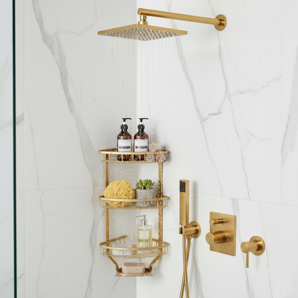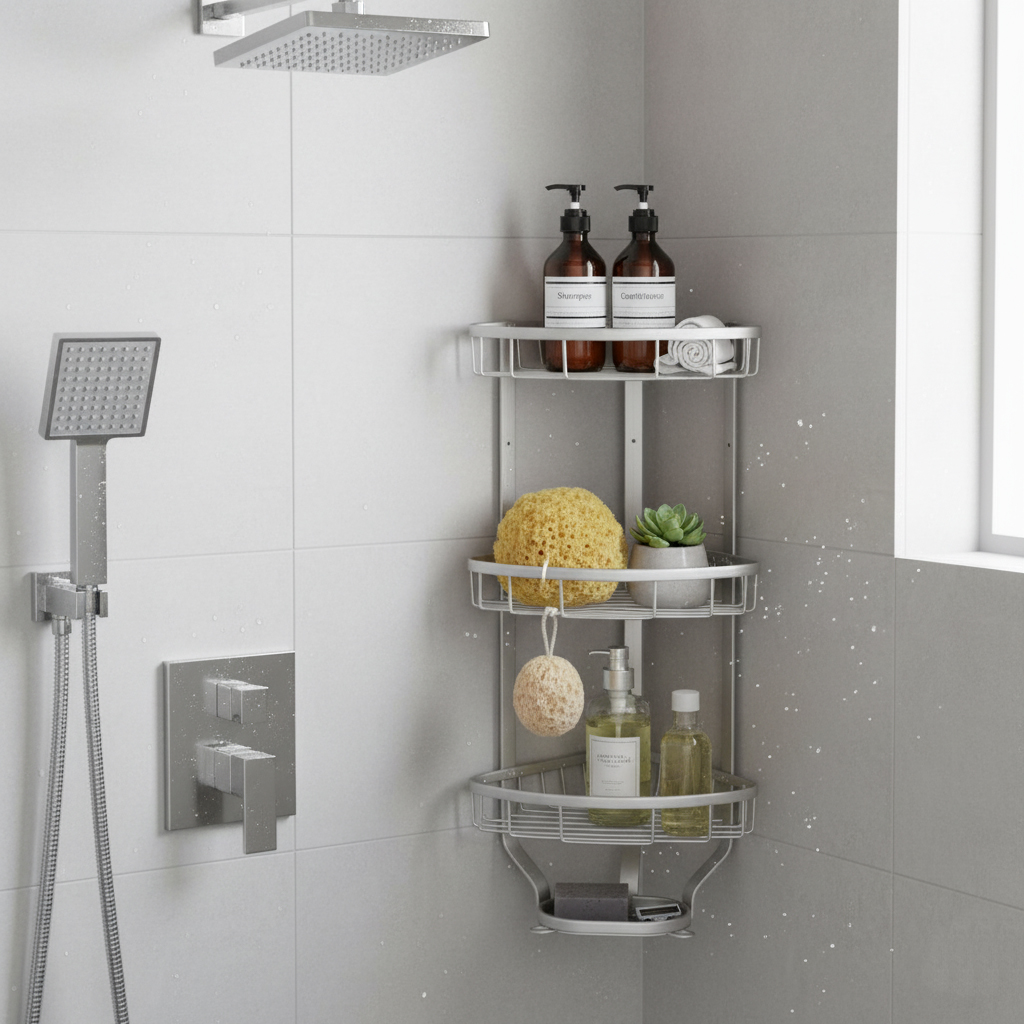 - قفسه کنجی آیناز ۳.۵ طبقه: ظرفیت بیشتر برای خانوادهها یا کسانی که به نظمدهی کاملتر نیاز دارند. طبقات بیشتر یعنی فضای بیشتر برای شامپو، شویندهها، اکسسوری و حولههای سبک.